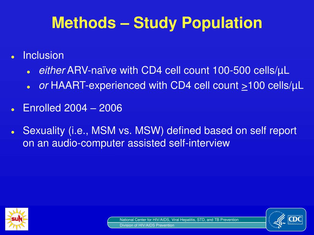 Methods – Study Population • Inclusion • eitherARV-naïve with CD4 cell count 100-500 cells/µL • orHAART-experienced with CD4 cell count >100 cells/µL • Enrolled 2004 – 2006 • Sexuality (i.e., MSM vs. MSW) defined based on self report on an audio-computer assisted self-interview