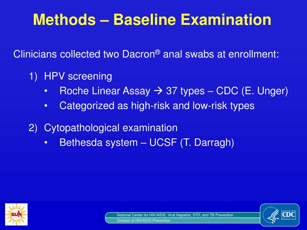 Methods – Baseline Examination • Clinicians collected two Dacron® anal swabs at enrollment: • HPV screening • Roche Linear Assay 37 types – CDC (E. Unger) • Categorized as high-risk and low-risk types • Cytopathological examination • Bethesda system – UCSF (T. Darragh)