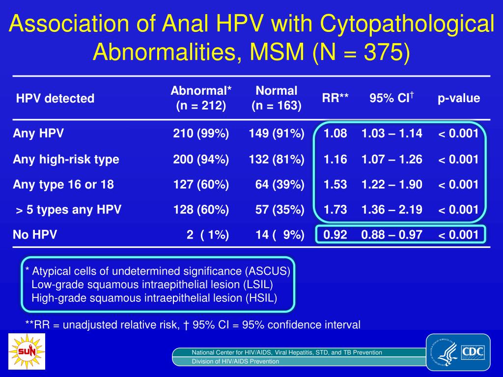 Association of Anal HPV with Cytopathological Abnormalities, MSM (N = 375) • * Atypical cells of undetermined significance (ASCUS) • Low-grade squamous intraepithelial lesion (LSIL) • High-grade squamous intraepithelial lesion (HSIL) • **RR = unadjusted relative risk, † 95% CI = 95% confidence interval