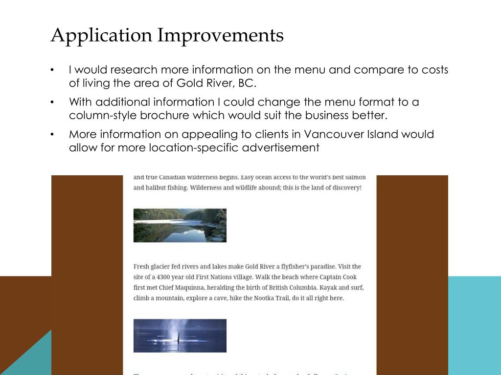 Application Improvements • I would research more information on the menu and compare to costs of living the area of Gold River, BC. • With additional information I could change the menu format to a column-style brochure which would suit the business better. • More information on appealing to clients in Vancouver Island would allow for more location-specific advertisement