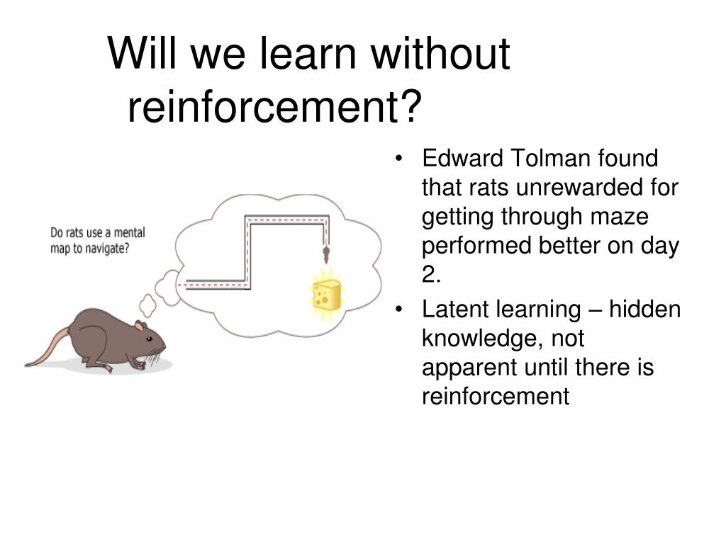 Will we learn without reinforcement? • Edward Tolman found that rats unrewarded for getting through maze performed better on day 2. • Latent learning – hidden knowledge, not apparent until there is reinforcement