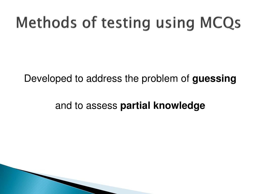 Methods of testing using MCQs Developed to address the problem of guessing and to assess partial knowledge