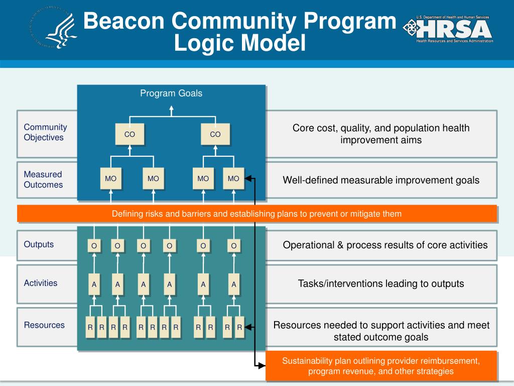 Beacon Community ProgramLogic Model Program Goals Core cost, quality, and population health improvement aims Community Objectives CO CO MO MO MO MO Measured Outcomes Well-defined measurable improvement goals Defining risks and barriers and establishing plans to prevent or mitigate them Operational & process results of core activities Outputs O O O O O O A A A A A A Tasks/interventions leading to outputs Activities Resources needed to support activities and meet stated outcome goals R R R R R R R R R R R R Resources Sustainability plan outlining provider reimbursement, program revenue, and other strategies 16
