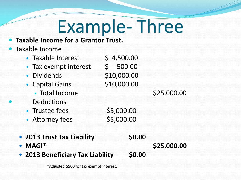 Example- Three • Taxable Income for a Grantor Trust. • Taxable Income • Taxable Interest $ 4,500.00 • Tax exempt interest $ 500.00 • Dividends $10,000.00 • Capital Gains $10,000.00 • Total Income $25,000.00 • Deductions • Trustee fees $5,000.00 • Attorney fees $5,000.00 • 2013 Trust Tax Liability $0.00 • MAGI* $25,000.00 • 2013 Beneficiary Tax Liability $0.00 *Adjusted $500 for tax exempt interest.