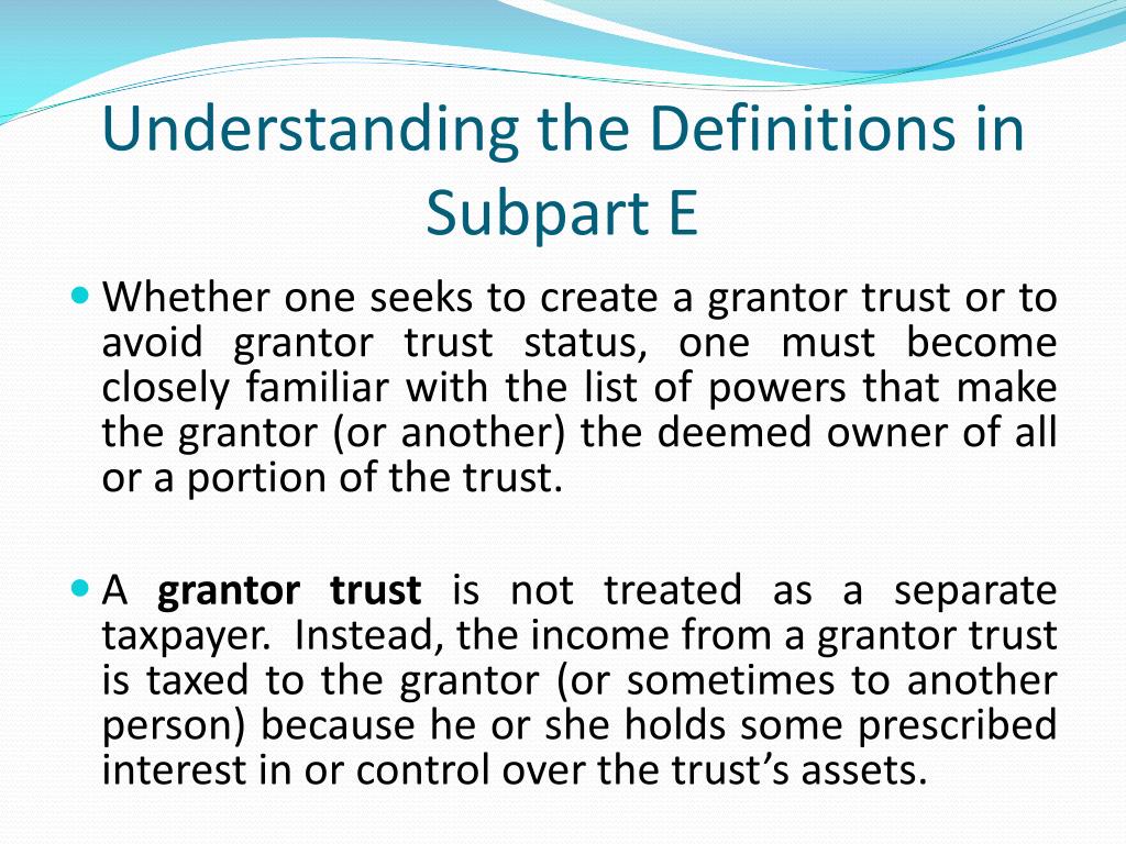 Understanding the Definitions in Subpart E • Whether one seeks to create a grantor trust or to avoid grantor trust status, one must become closely familiar with the list of powers that make the grantor (or another) the deemed owner of all or a portion of the trust. • A grantor trust is not treated as a separate taxpayer. Instead, the income from a grantor trust is taxed to the grantor (or sometimes to another person) because he or she holds some prescribed interest in or control over the trust’s assets.
