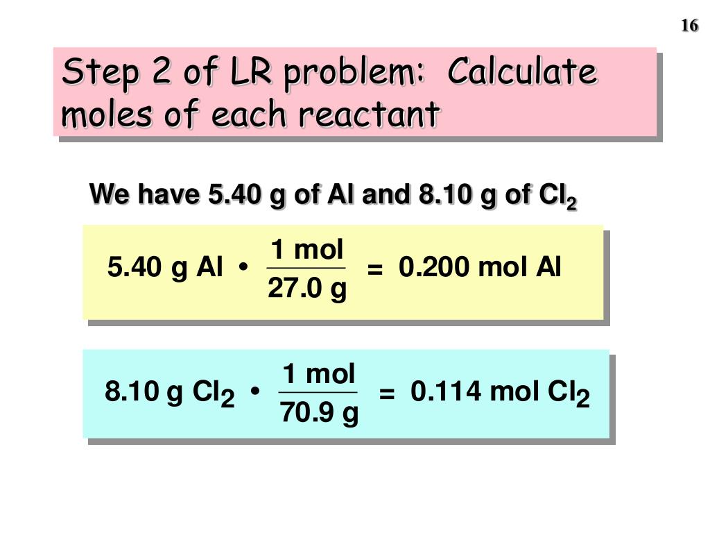 Step 2 of LR problem: Calculate moles of each reactant We have 5.40 g of Al and 8.10 g of Cl2