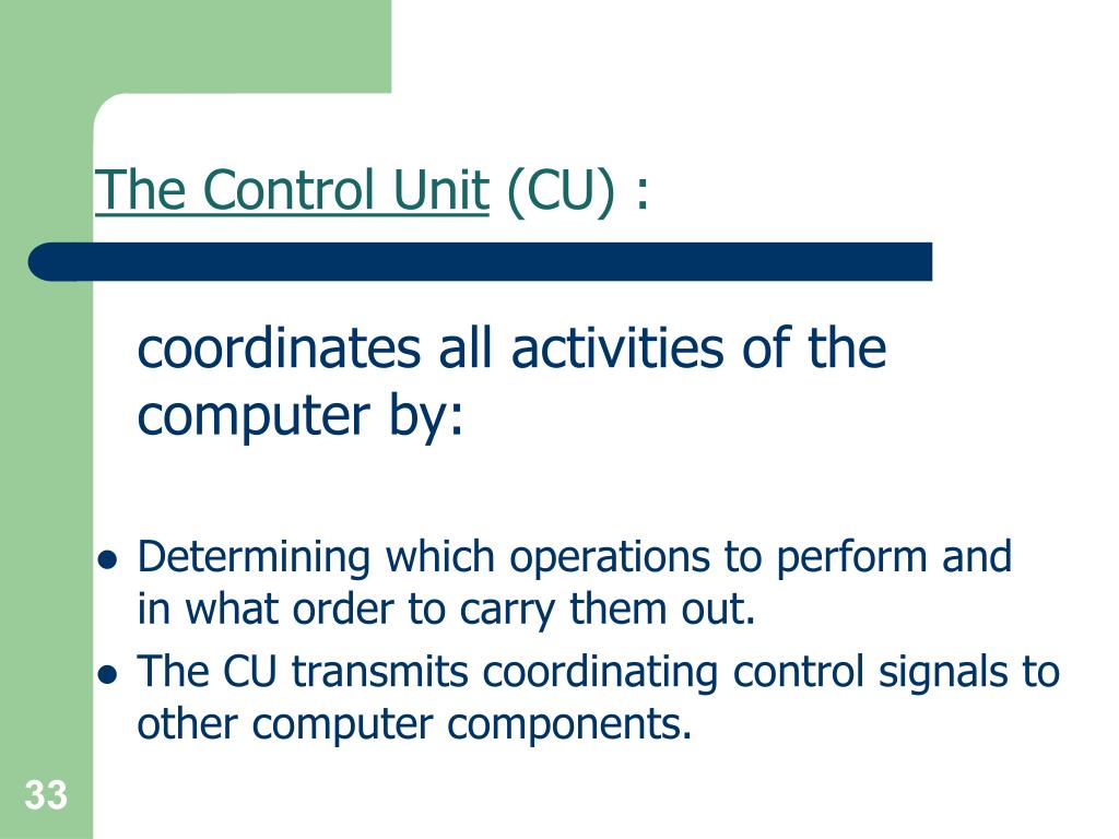 The Control Unit (CU) : coordinates all activities of the computer by: • Determining which operations to perform and in what order to carry them out. • The CU transmits coordinating control signals to other computer components.