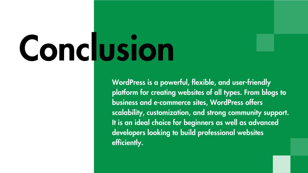 Conclusion WordPress is a powerful, flexible, and user-friendly platform for creating websites of all types. From blogs to business and e-commerce sites, WordPress offers scalability, customization, and strong community support. It is an ideal choice for beginners as well as advanced developers looking to build professional websites efficiently.