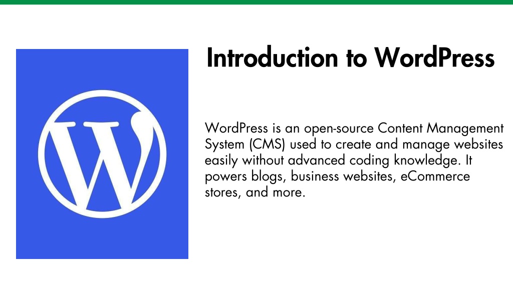 Introduction to WordPress WordPress is an open-source Content Management System (CMS) used to create and manage websites easily without advanced coding knowledge. It powers blogs, business websites, eCommerce stores, and more.