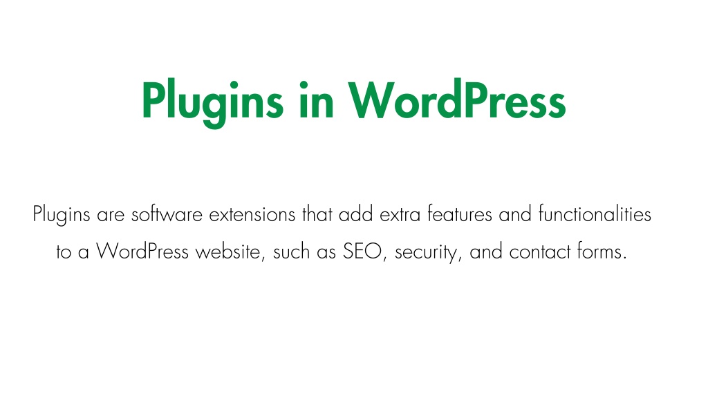 Plugins in WordPress Plugins are software extensions that add extra features and functionalities to a WordPress website, such as SEO, security, and contact forms. Potential Opportunities With the acceleration of digital transformation, we see huge potential opportunities in industries such as healthcare and finance.