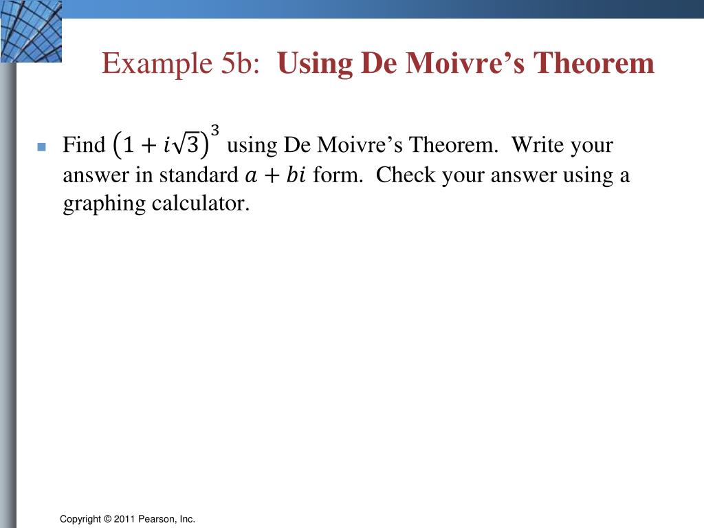 Example 5a: Using De Moivre’s Theorem Calculate . Write your answer in standard form.