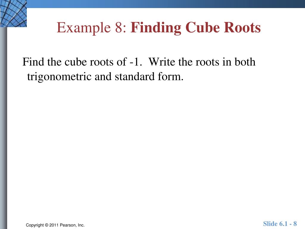 Example 8: Finding Cube Roots Find the cube roots of -1. Write the roots in both trigonometric and standard form.