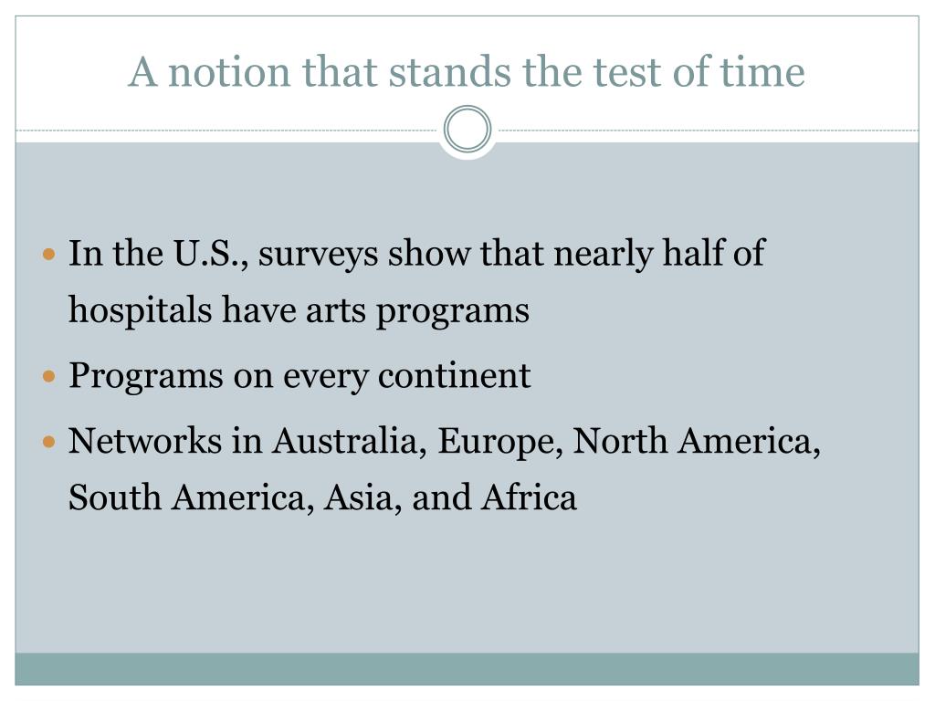 A notion that stands the test of time In the U.S., surveys show that nearly half of hospitals have arts programs Programs on every continent Networks in Australia, Europe, North America, South America, Asia, and Africa