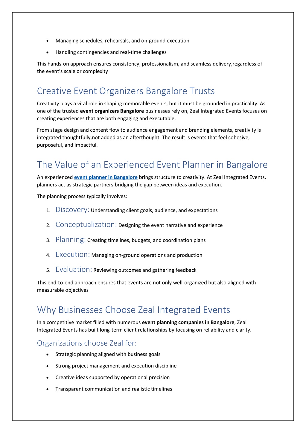 • Managing schedules, rehearsals, and on-ground execution • Handling contingencies and real-time challenges This hands-on approach ensures consistency, professionalism, and seamless delivery,regardless of the event’s scale or complexity Creative Event Organizers Bangalore Trusts Creativity plays a vital role in shaping memorable events, but it must be grounded in practicality. As one of the trusted event organizers Bangalore businesses rely on, Zeal Integrated Events focuses on creating experiences that are both engaging and executable. From stage design and content flow to audience engagement and branding elements, creativity is integrated thoughtfully,not added as an afterthought. The result is events that feel cohesive, purposeful, and impactful. The Value of an Experienced Event Planner in Bangalore An experienced event planner in Bangalore brings structure to creativity. At Zeal Integrated Events, planners act as strategic partners,bridging the gap between ideas and execution. The planning process typically involves: 1.Discovery: Understanding client goals, audience, and expectations 2.Conceptualization: Designing the event narrative and experience 3.Planning: Creating timelines, budgets, and coordination plans 4.Execution: Managing on-ground operations and production 5.Evaluation: Reviewing outcomes and gathering feedback This end-to-end approach ensures that events are not only well-organized but also aligned with measurable objectives Why Businesses Choose Zeal Integrated Events In a competitive market filled with numerous event planning companies in Bangalore, Zeal Integrated Events has built long-term client relationships by focusing on reliability and clarity. Organizations choose Zeal for: • Strategic planning aligned with business goals • Strong project management and execution discipline • Creative ideas supported by operational precision • Transparent communication and realistic timelines