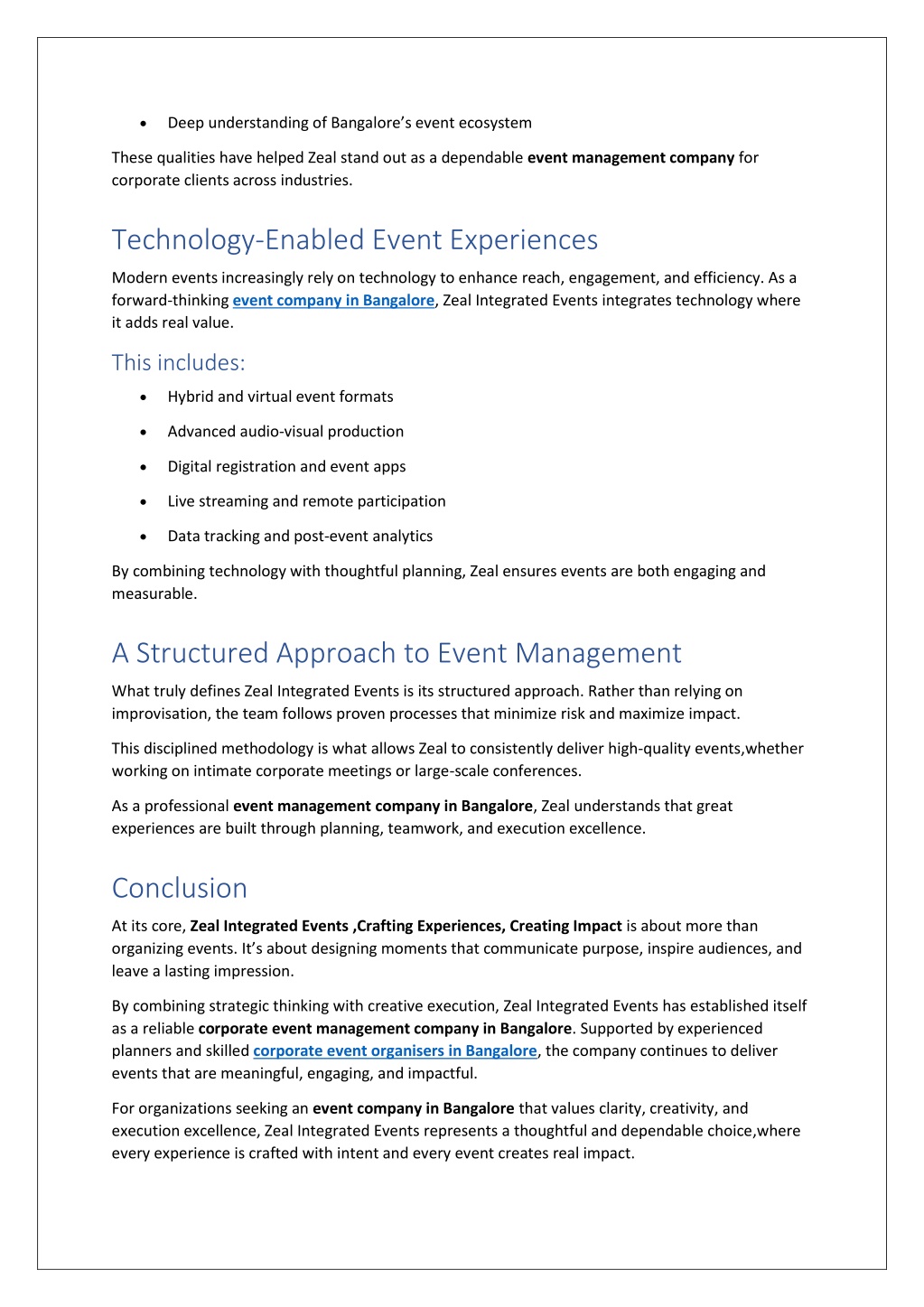 • Deep understanding of Bangalore’s event ecosystem These qualities have helped Zeal stand out as a dependable event management company for corporate clients across industries. Technology-Enabled Event Experiences Modern events increasingly rely on technology to enhance reach, engagement, and efficiency. As a forward-thinking event company in Bangalore, Zeal Integrated Events integrates technology where it adds real value. This includes: • Hybrid and virtual event formats • Advanced audio-visual production • Digital registration and event apps • Live streaming and remote participation • Data tracking and post-event analytics By combining technology with thoughtful planning, Zeal ensures events are both engaging and measurable. A Structured Approach to Event Management What truly defines Zeal Integrated Events is its structured approach. Rather than relying on improvisation, the team follows proven processes that minimize risk and maximize impact. This disciplined methodology is what allows Zeal to consistently deliver high-quality events,whether working on intimate corporate meetings or large-scale conferences. As a professional event management company in Bangalore, Zeal understands that great experiences are built through planning, teamwork, and execution excellence. Conclusion At its core, Zeal Integrated Events ,Crafting Experiences, Creating Impact is about more than organizing events. It’s about designing moments that communicate purpose, inspire audiences, and leave a lasting impression. By combining strategic thinking with creative execution, Zeal Integrated Events has established itself as a reliable corporate event management company in Bangalore. Supported by experienced planners and skilled corporate event organisers in Bangalore, the company continues to deliver events that are meaningful, engaging, and impactful. For organizations seeking an event company in Bangalore that values clarity, creativity, and execution excellence, Zeal Integrated Events represents a thoughtful and dependable choice,where every experience is crafted with intent and every event creates real impact.