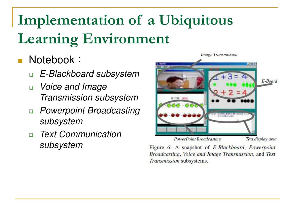 Notebook: E-Blackboard subsystem Voice and Image Transmission subsystem Powerpoint Broadcasting subsystem Text Communication subsystem Implementation of a UbiquitousLearning Environment