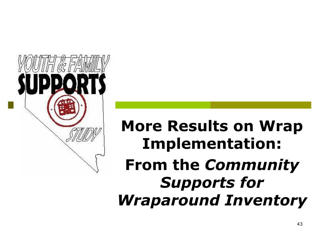 A summary of research on wraparound implementation • There are connections between system support for wraparound implementation and fidelity • There are connections between wrap fidelity and child and family outcomes • We are beginning to get a sense of what “high” fidelity is in terms of scores on tools like the WFI • BUT: The research is still preliminary, and the field is looking for additional evidence