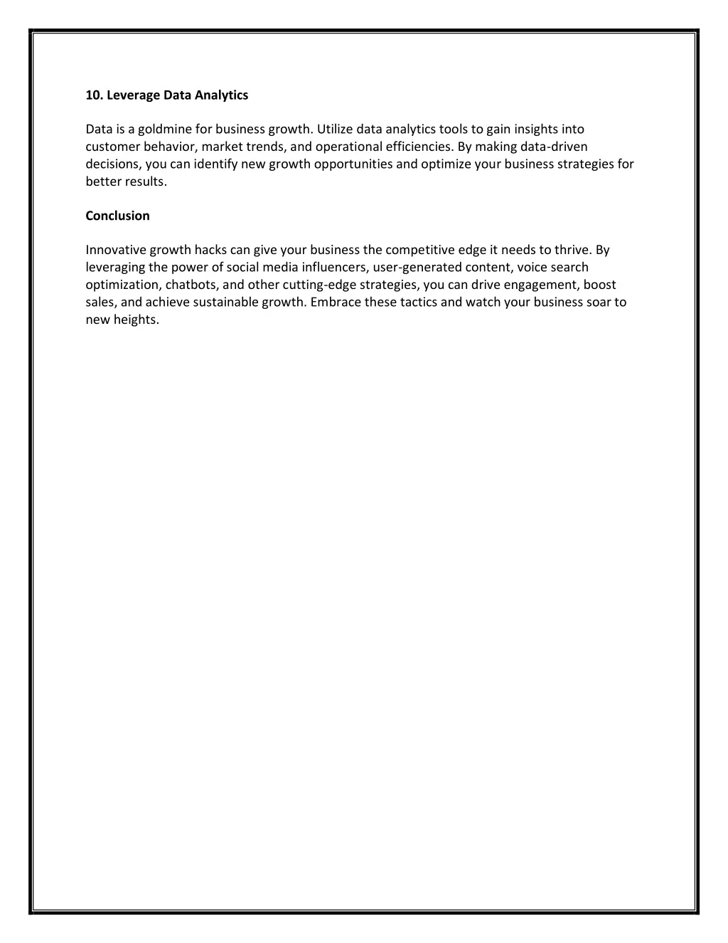 10. Leverage Data Analytics Data is a goldmine for business growth. Utilize data analytics tools to gain insights into customer behavior, market trends, and operational efficiencies. By making data-driven decisions, you can identify new growth opportunities and optimize your business strategies for better results. Conclusion Innovative growth hacks can give your business the competitive edge it needs to thrive. By leveraging the power of social media influencers, user-generated content, voice search optimization, chatbots, and other cutting-edge strategies, you can drive engagement, boost sales, and achieve sustainable growth. Embrace these tactics and watch your business soar to new heights.