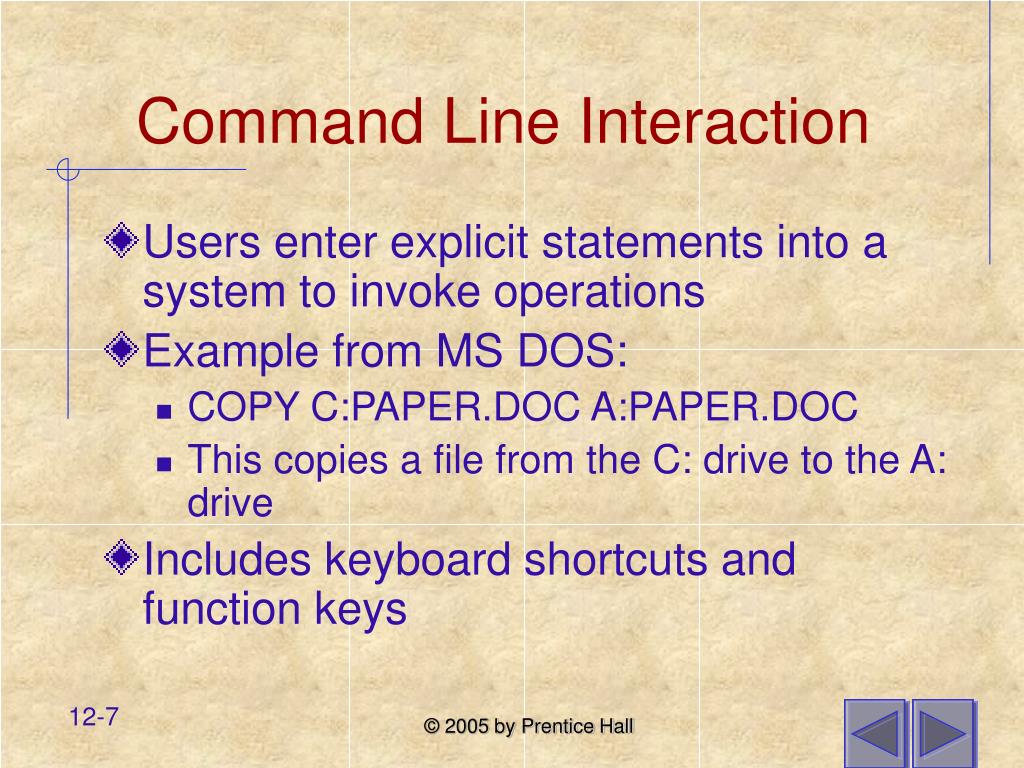 Command Line Interaction • Users enter explicit statements into a system to invoke operations • Example from MS DOS: • COPY C:PAPER.DOC A:PAPER.DOC • This copies a file from the C: drive to the A: drive • Includes keyboard shortcuts and function keys