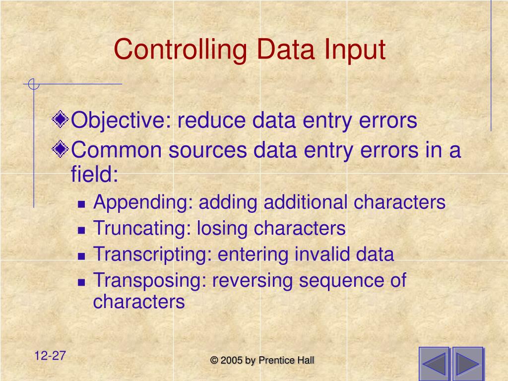 Controlling Data Input • Objective: reduce data entry errors • Common sources data entry errors in a field: • Appending: adding additional characters • Truncating: losing characters • Transcripting: entering invalid data • Transposing: reversing sequence of characters