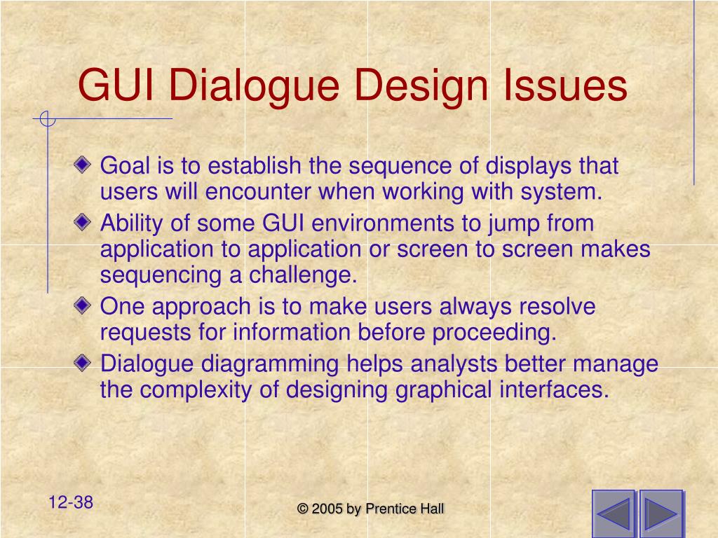 GUI Dialogue Design Issues • Goal is to establish the sequence of displays that users will encounter when working with system. • Ability of some GUI environments to jump from application to application or screen to screen makes sequencing a challenge. • One approach is to make users always resolve requests for information before proceeding. • Dialogue diagramming helps analysts better manage the complexity of designing graphical interfaces.