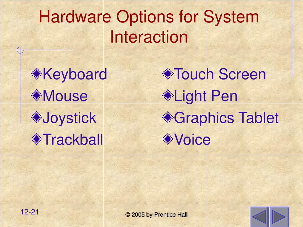 Keyboard Mouse Joystick Trackball Touch Screen Light Pen Graphics Tablet Voice Hardware Options for System Interaction
