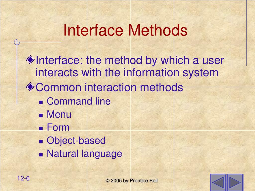 Interface Methods • Interface: the method by which a user interacts with the information system • Common interaction methods • Command line • Menu • Form • Object-based • Natural language