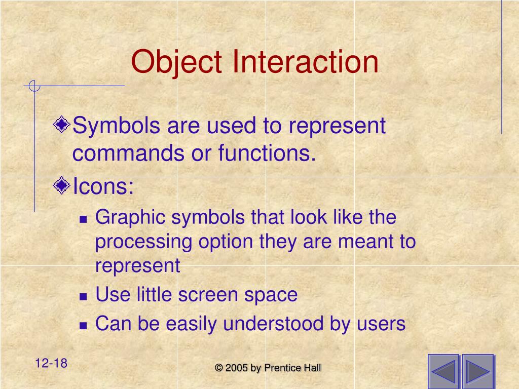 Object Interaction • Symbols are used to represent commands or functions. • Icons: • Graphic symbols that look like the processing option they are meant to represent • Use little screen space • Can be easily understood by users