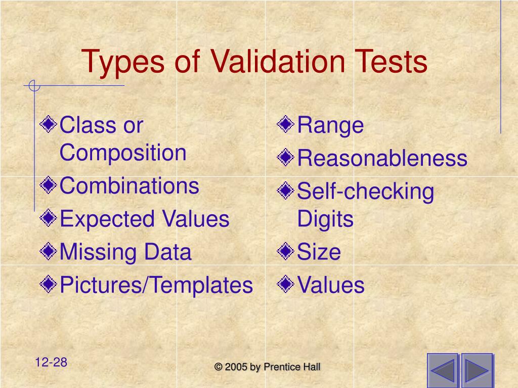 Class or Composition Combinations Expected Values Missing Data Pictures/Templates Range Reasonableness Self-checking Digits Size Values Types of Validation Tests