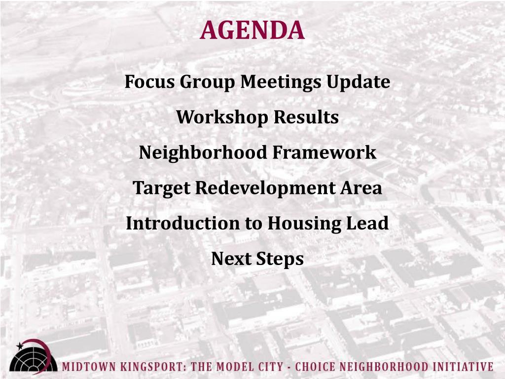 AGENDA Focus Group Meetings Update Workshop Results Neighborhood Framework Target Redevelopment Area Introduction to Housing Lead Next Steps