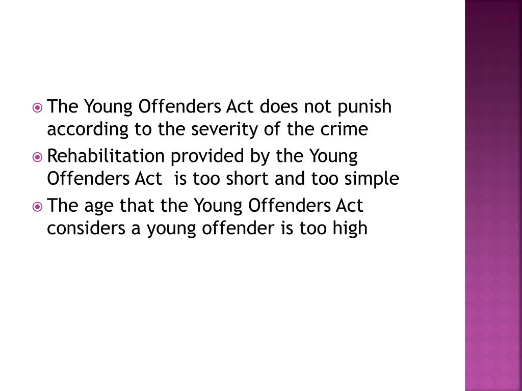 The Young Offenders Act does not punish according to the severity of the crime • Rehabilitation provided by the Young Offenders Act is too short and too simple • The age that the Young Offenders Act considers a young offender is too high