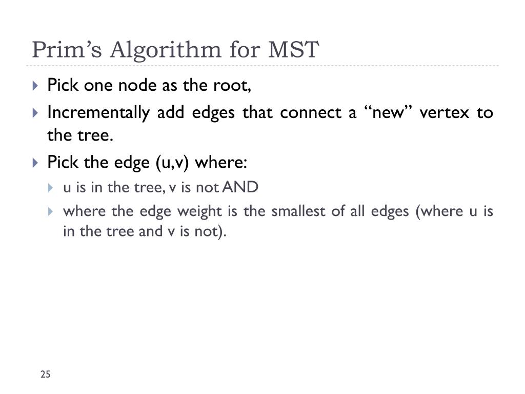 Prim’s Algorithm for MST • Pick one node as the root, • Incrementally add edges that connect a “new” vertex to the tree. • Pick the edge (u,v) where: • u is in the tree, v is not AND • where the edge weight is the smallest of all edges (where u is in the tree and v is not).