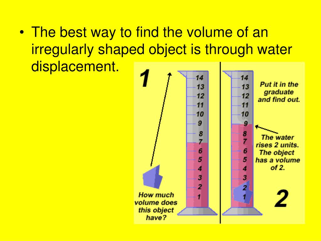 The best way to find the volume of an irregularly shaped object is through water displacement.