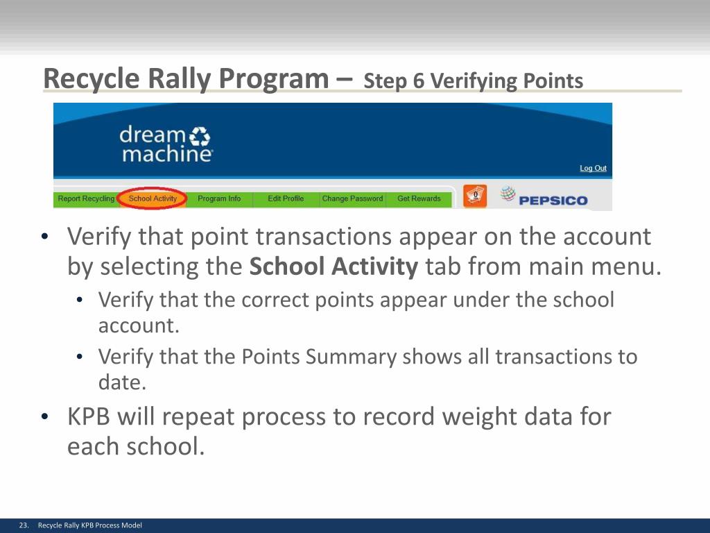 Recycle Rally Program – Step 6 Verifying Points • Verify that point transactions appear on the account by selecting the School Activity tab from main menu. • Verify that the correct points appear under the school account. • Verify that the Points Summary shows all transactions to date. • KPB will repeat process to record weight data for each school.