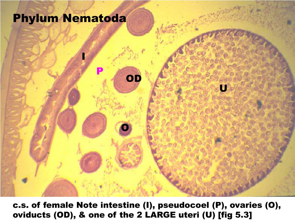 c.s. of female Note intestine (I), pseudocoel (P), ovaries (O), oviducts (OD), & one of the 2 LARGE uteri (U) [fig 5.3] Phylum Nematoda I P OD U O