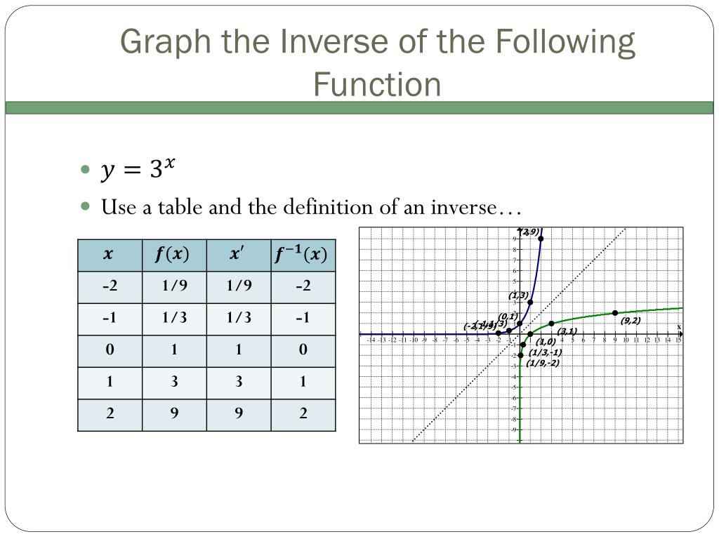 Graph the Inverse of the Following Function • Use a table and the definition of an inverse…