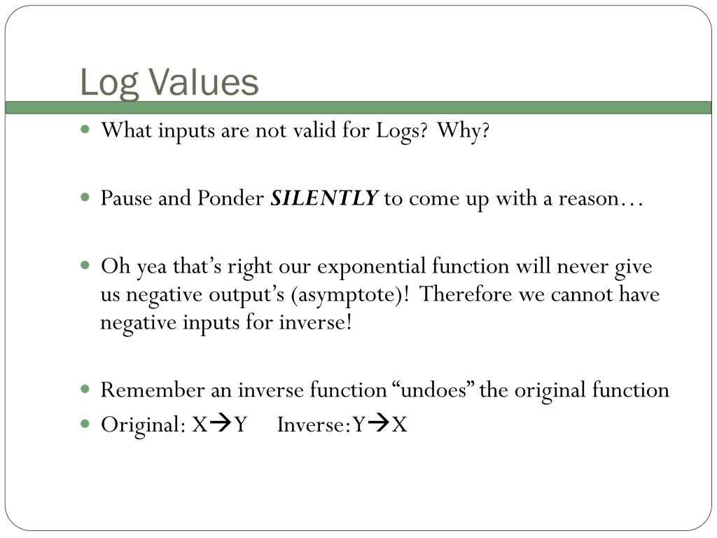 Log Values • What inputs are not valid for Logs? Why? • Pause and Ponder SILENTLY to come up with a reason… • Oh yea that’s right our exponential function will never give us negative output’s (asymptote)! Therefore we cannot have negative inputs for inverse! • Remember an inverse function “undoes” the original function • Original: XY Inverse:YX