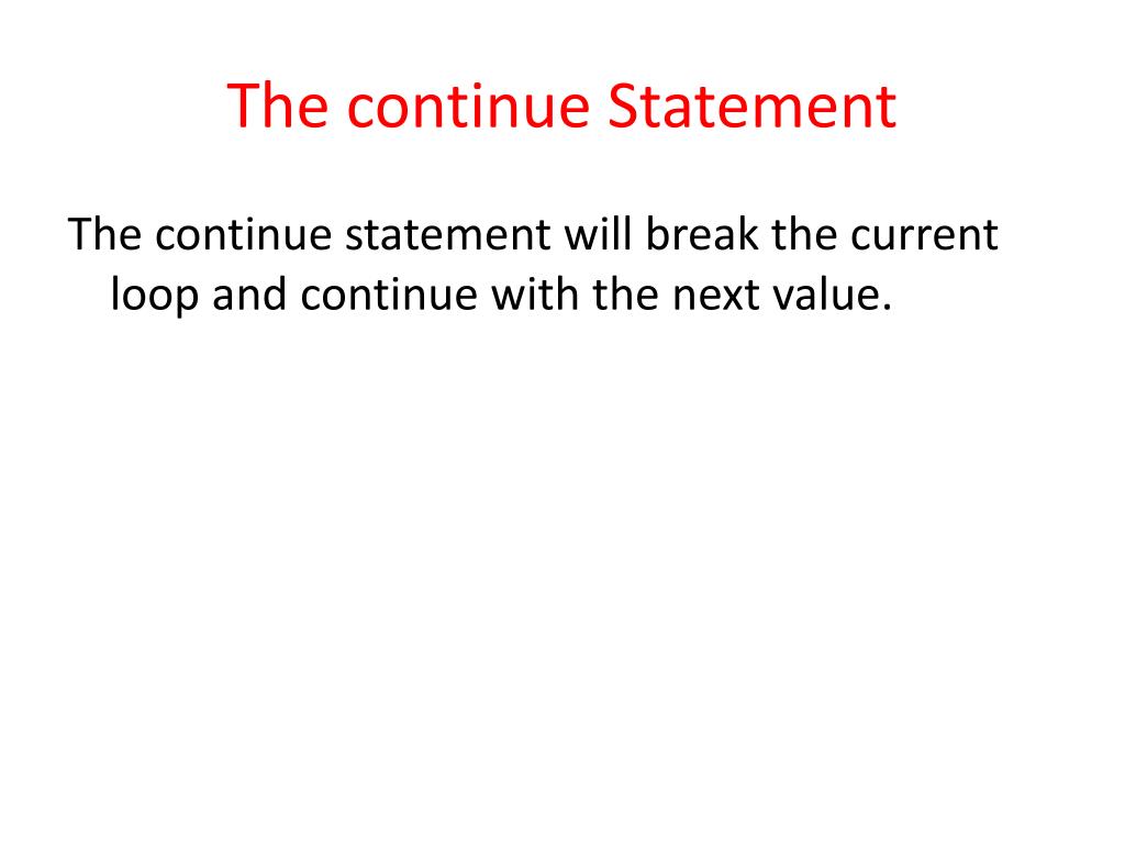 The continue Statement The continue statement will break the current loop and continue with the next value.