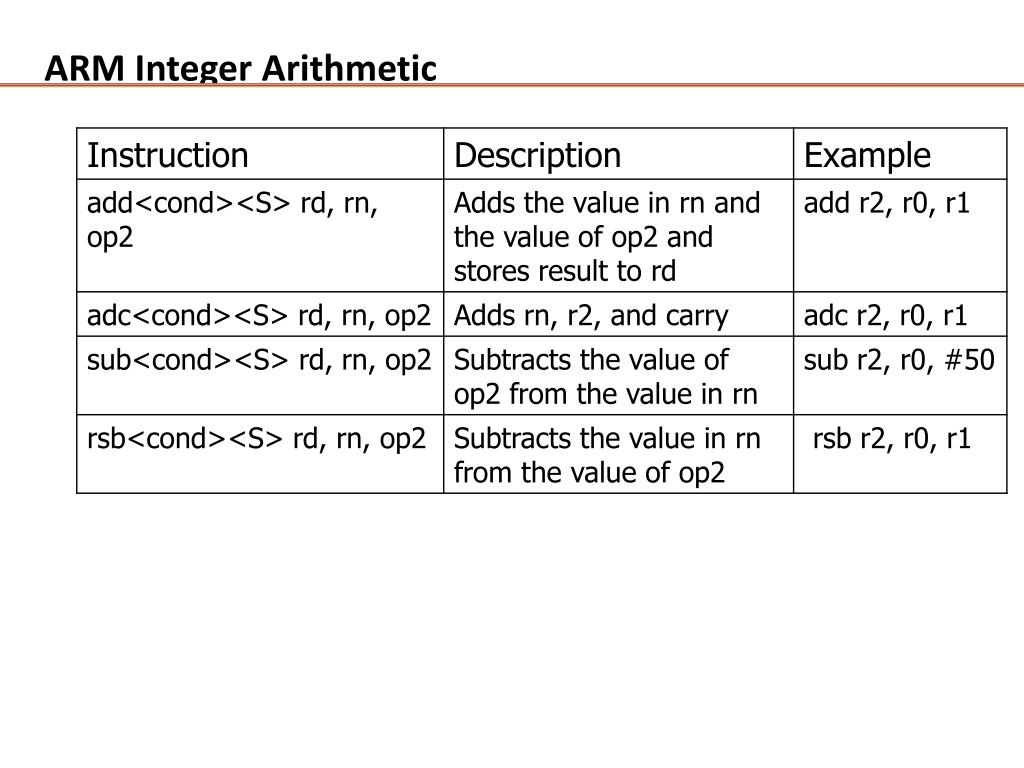 Memory r0 r1 Offset SourceRegisterfor STR UpdatedBaseRegister 0x5 0x20c 12 0x20c 0x5 0x200 r1 OriginalBaseRegister 0x200 Post-indexed Addressing Mode • Example: STR r0, [r1], #12 • To auto-increment the base register to location 0x1f4 instead use: • STR r0, [r1], #-12 • If r2 contains 3, auto-increment base register to 0x20c by multiplying this by 4: • STR r0, [r1], r2, LSL #2