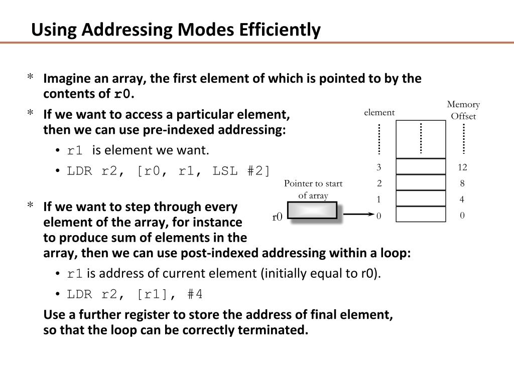 Memory Offset element 3 12 Pointer to start of array 2 8 1 4 r0 0 0 Using Addressing Modes Efficiently • Imagine an array, the first element of which is pointed to by the contents of r0. • If we want to access a particular element,then we can use pre-indexed addressing: • r1 is element we want. • LDR r2, [r0, r1, LSL #2] • If we want to step through everyelement of the array, for instanceto produce sum of elements in thearray, then we can use post-indexed addressing within a loop: • r1 is address of current element (initially equal to r0). • LDR r2, [r1], #4 Use a further register to store the address of final element,so that the loop can be correctly terminated.