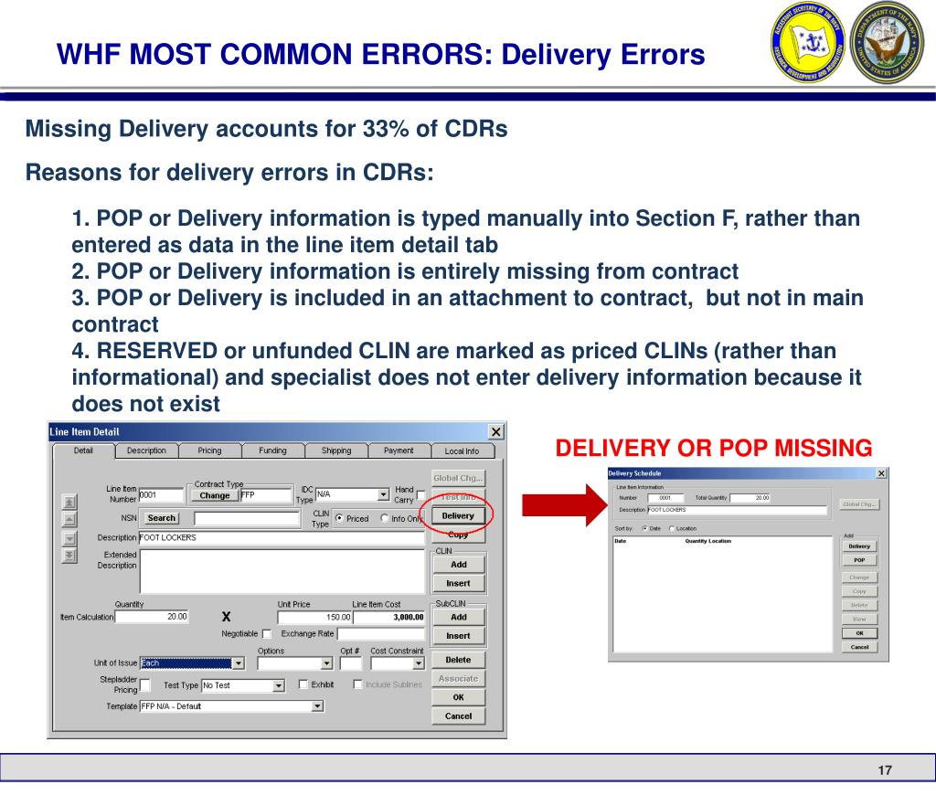 WHF MOST COMMON ERRORS: Delivery Errors • Missing Ship-to UIC/DODAAC accounts for 23% of CDRs • Reasons for ship-to errors in CDRs: • 1. Delivery information is typed manually into Section F, rather than entered as data in the line item detail tab • 2. Delivery date/shipping input used for services CLIN rather than POP • 3. POP entered for product CLINs and Ship-To information is missing • 4. Delivery/POP information is placed in Informational CLIN/SLIN rather than Priced CLIN/SLIN SHIP TO ADDRESS/UIC MISSING