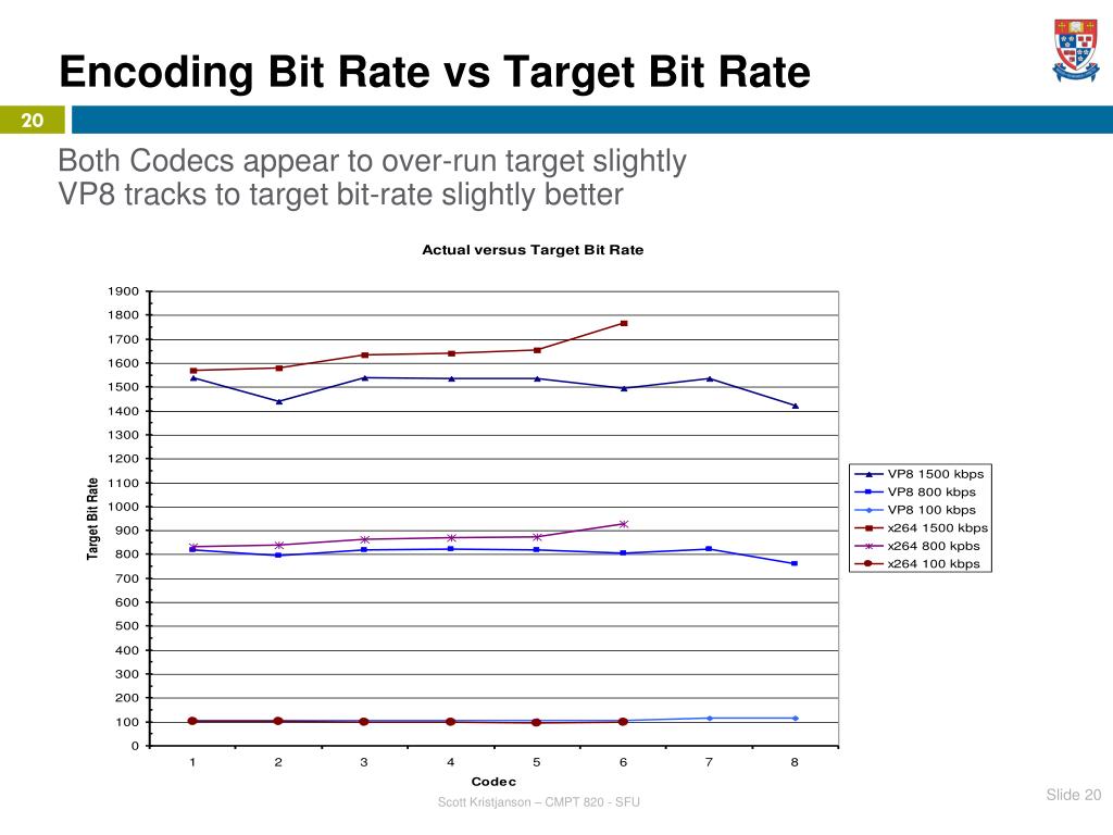 Encoding Bit Rate vs Target Bit Rate • Both Codecs appear to over-run target slightly • VP8 tracks to target bit-rate slightly better