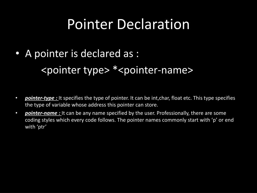 Pointer Declaration • A pointer is declared as : <pointer type> *<pointer-name> • pointer-type : It specifies the type of pointer. It can be int,char, float etc. This type specifies the type of variable whose address this pointer can store. • pointer-name : It can be any name specified by the user. Professionally, there are some coding styles which every code follows. The pointer names commonly start with ‘p’ or end with ‘ptr’