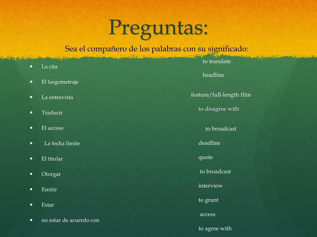 Preguntas: Sea el compañero de los palabras con su significado: • La cita • El largometraje • La entrevista • Traducir • El acceso • La fecha limite • El titular • Otorgar • Emitir • Estar • no estar de acuerdo con to translate headline feature/full-length film to disagreewith to broadcast deadline quote to broadcast interview to grant access to agreewith