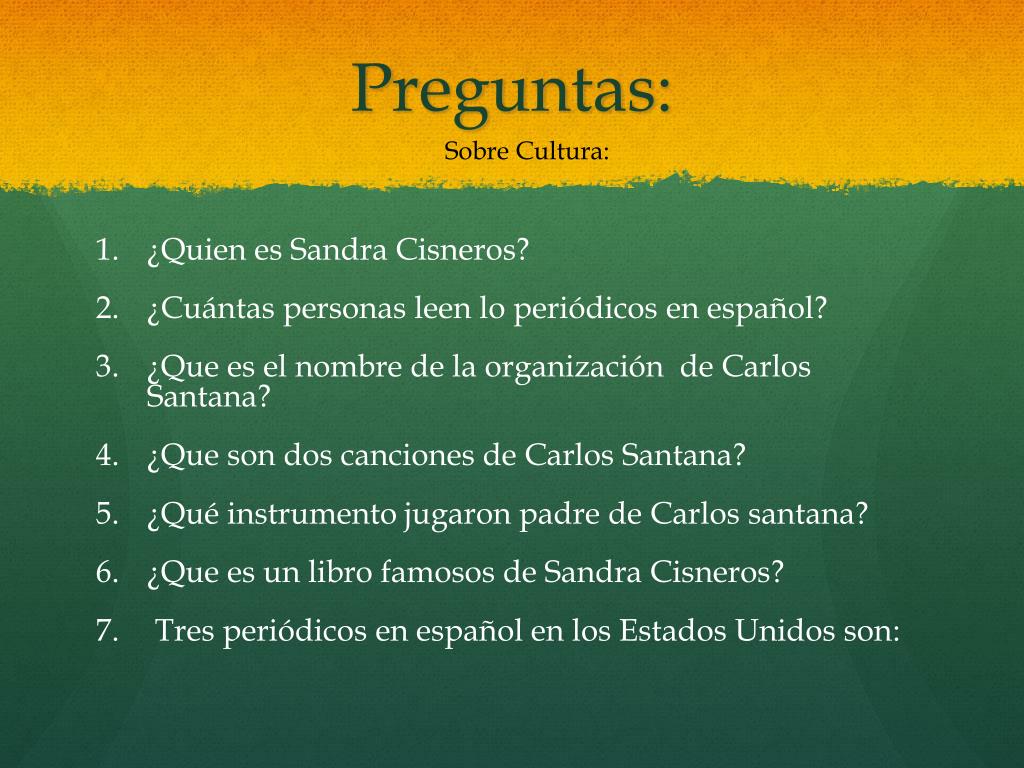 Preguntas: SobreCultura: • ¿Quien es Sandra Cisneros? • ¿Cuántas personas leen lo periódicos en español? • ¿Que es el nombre de la organización de Carlos Santana? • ¿Que son dos canciones de Carlos Santana? • ¿Qué instrumento jugaron padre de Carlos santana? • ¿Que es un libro famosos de Sandra Cisneros? • Tres periódicos en español en los Estados Unidos son: