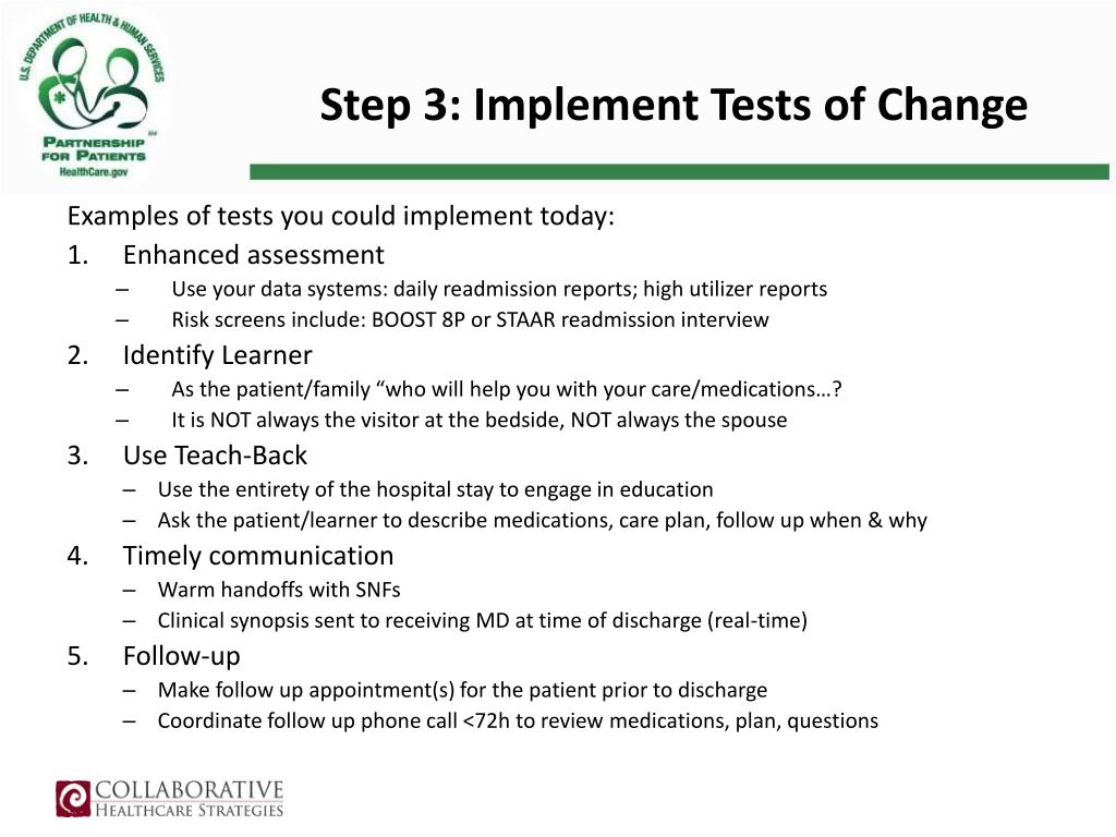 Step 3: Implement Tests of Change Examples of tests you could implement today: • Enhanced assessment • Use your data systems: daily readmission reports; high utilizer reports • Risk screens include: BOOST 8P or STAAR readmission interview • Identify Learner • As the patient/family “who will help you with your care/medications…? • It is NOT always the visitor at the bedside, NOT always the spouse • Use Teach-Back • Use the entirety of the hospital stay to engage in education • Ask the patient/learner to describe medications, care plan, follow up when & why • Timely communication • Warm handoffs with SNFs • Clinical synopsis sent to receiving MD at time of discharge (real-time) • Follow-up • Make follow up appointment(s) for the patient prior to discharge • Coordinate follow up phone call <72h to review medications, plan, questions