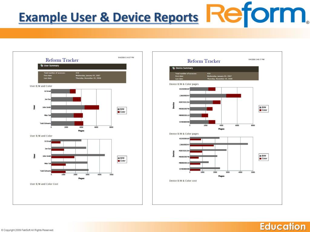Monitor and Control Print Activities Reform Tracker • Monitor and control the print activity of students and staff • Generate detailed document activity and cost reports. • Recapture document costs by charging for print jobs or copies made in school libraries or computer labs. • Allows organizations to significantly reduce costs and environmental impact.