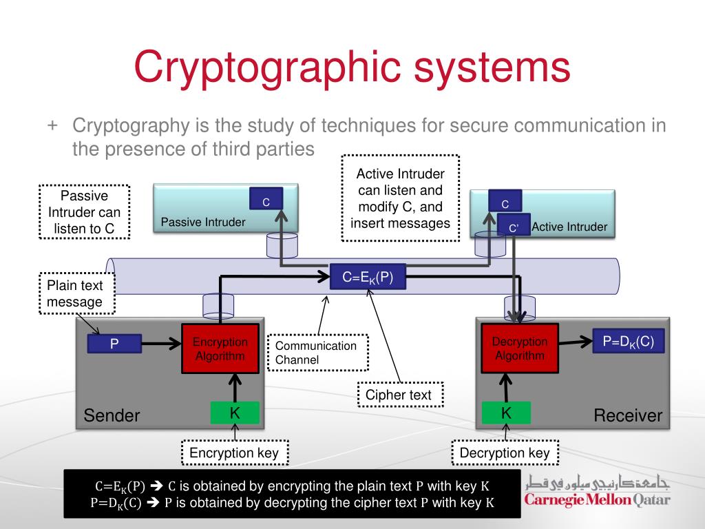 Cryptographic systems • Cryptography is the study of techniques for secure communication in the presence of third parties Active Intruder can listen and modify C, and insert messages Intruder Passive Intruder can listen to C Passive Intruder C Active Intruder C Intruder C’ C=EK(P) Plain text message Sender Receiver Decryption Algorithm Encryption Algorithm P=DK(C) P Communication Channel Cipher text K K Encryption key Decryption key C=EK(P) C is obtained by encrypting the plain text P with key K P=DK(C) Pis obtained by decrypting the cipher text P with key K