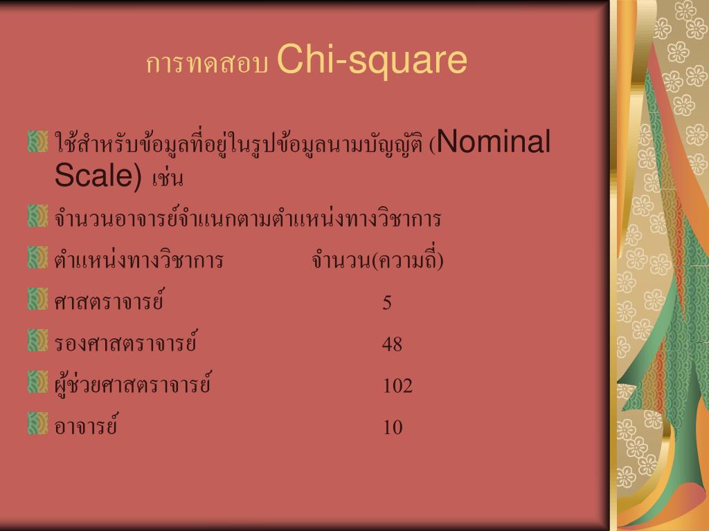 การทดสอบ Chi-square • ใช้สำหรับข้อมูลที่อยู่ในรูปข้อมูลนามบัญญัติ (Nominal Scale) เช่น • จำนวนอาจารย์จำแนกตามตำแหน่งทางวิชาการ • ตำแหน่งทางวิชาการ จำนวน(ความถี่) • ศาสตราจารย์ 5 • รองศาสตราจารย์ 48 • ผู้ช่วยศาสตราจารย์ 102 • อาจารย์ 10
