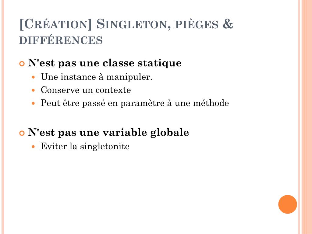[Création] Singleton, pièges & différences • N'est pas une classe statique • Une instance à manipuler. • Conserve un contexte • Peut être passé en paramètre à une méthode • N'est pas une variable globale • Eviter la singletonite